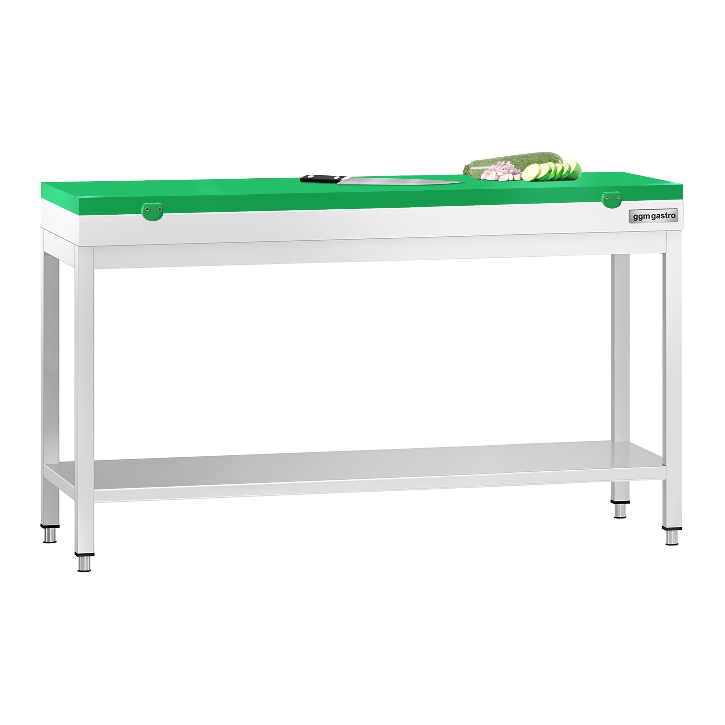 Arbeidsbord i rustfritt stål PREMIUM - 1,6 m - med underhylle - inkl. skjærebrett i grønt