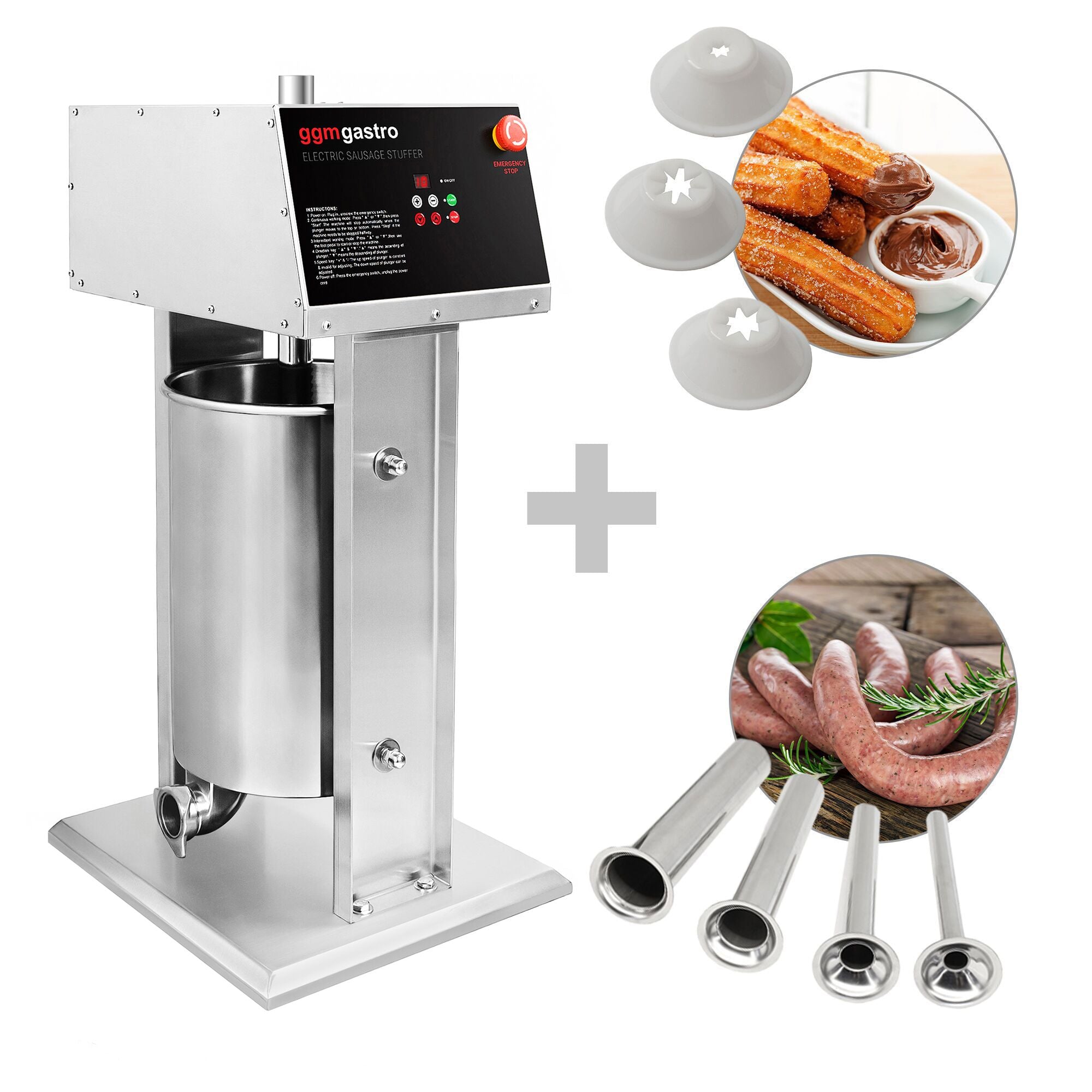 Elektrisk pølsestapper og churro-maskin - 30 liter - 180 watt - rustfritt stål - inkl. 3 pølsestapper- og 3 churro-tilbehør