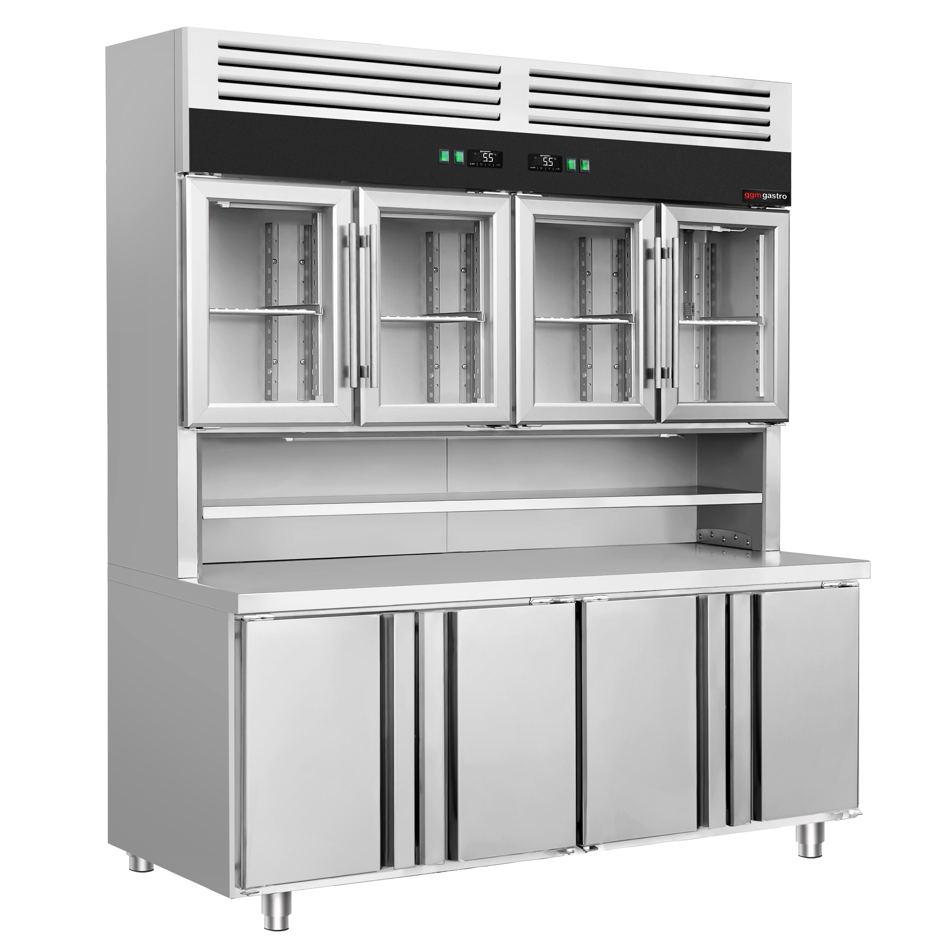 Kjølekombinasjon med topp- og bunnkjøling - 1800 mm - 4 glassdører øverst, 4 dører nederst og benkeplate