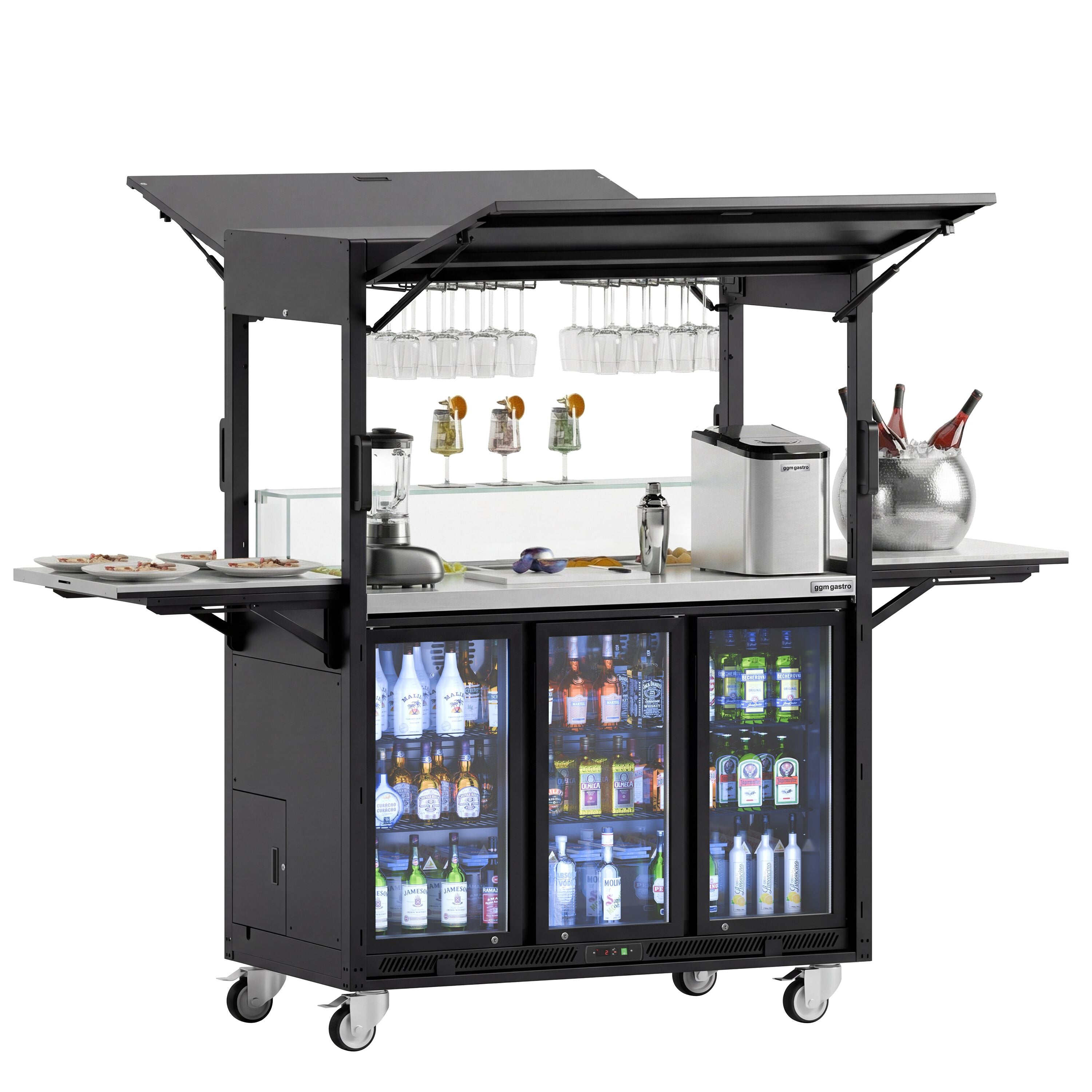 Mobil cocktailstasjon - med barkjøleskap, arbeidsflate, glassplate og LED-belysning - hengslet