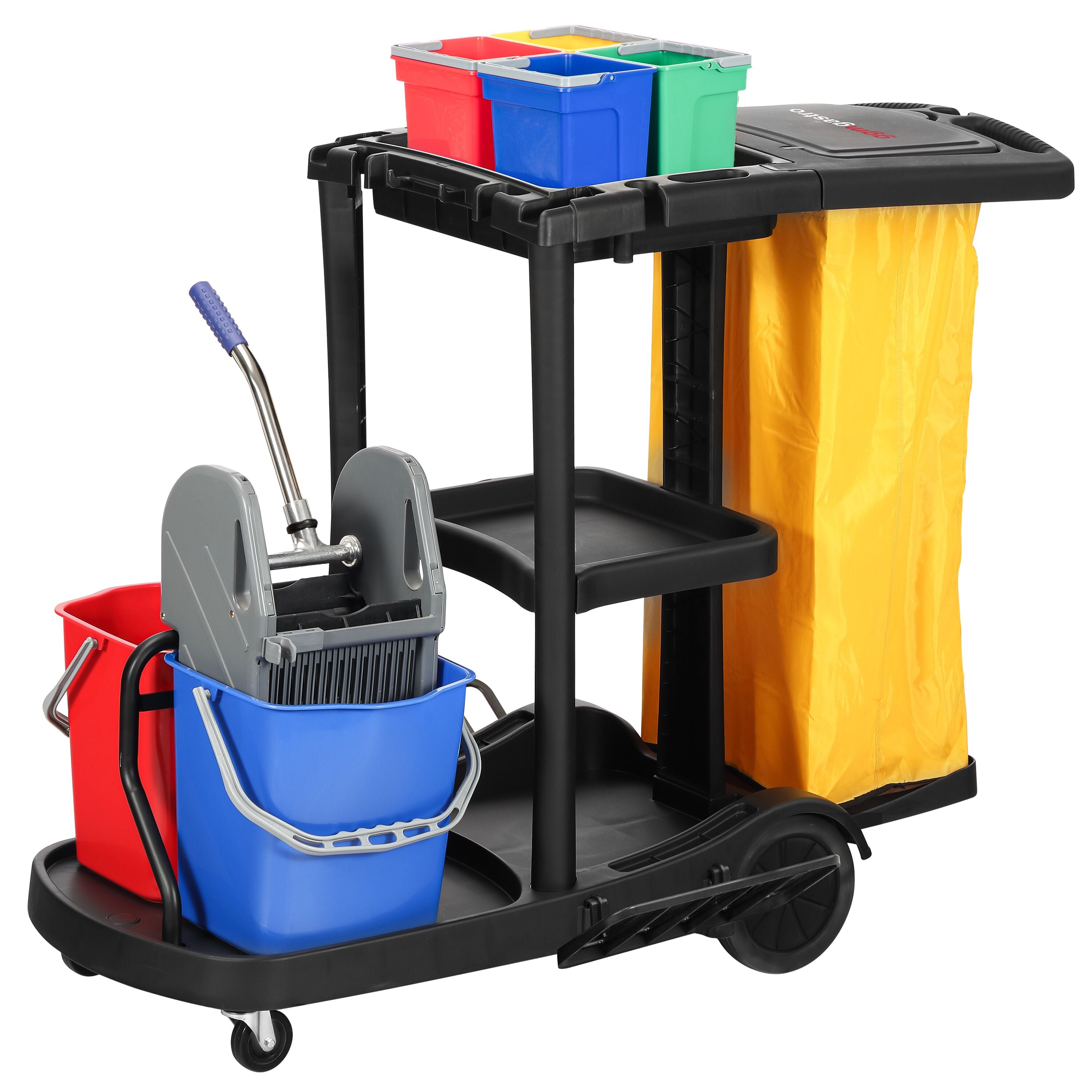 Rengjøringsvogn - med 6 beholdere, moppevrider og vaskepose - Svart